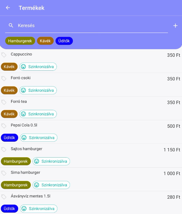 A cikkek listáját a Menü/Termékek alatt találja meg. Itt az üzletéhez rendelt cikkek jelennek meg.