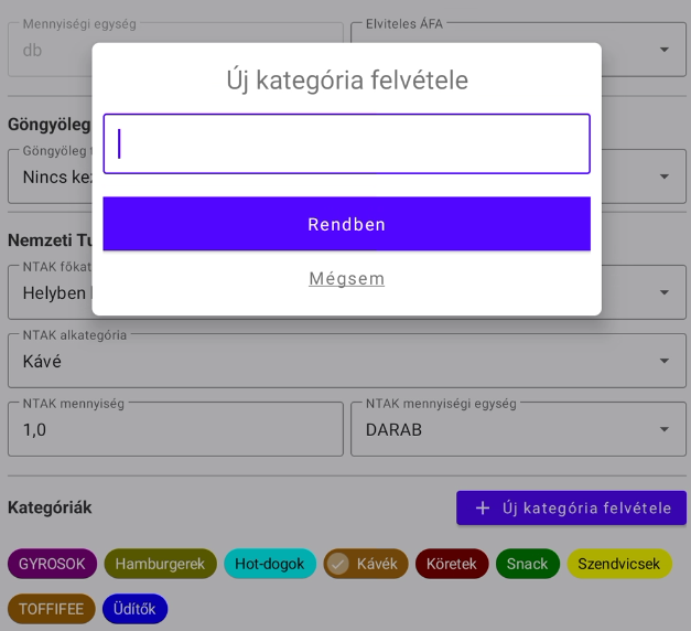 Fő- és alkategóriába kell a cikket sorolni, meg kell adni a mennyiségi egységet és a mennyiséget.